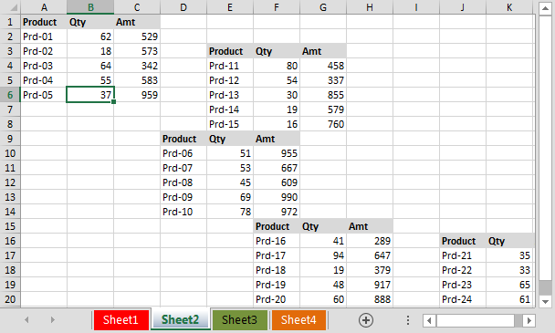 ยกตัวอย่างข้อมูลของเราเป็นข้อมูล Product อยู่ใน Sheet2 - Sheet4 ประกอบด้วย Product Name, Quantity และ Amount โดยต้องการจะ Lookup ค่า Product ในเซลล์ A4 ของ Sheet1 จาก Sheet2 - Sheet4 โดยให้สามารถค้นหาได้ทุกคอลัมน์ หากค้นพบให้นำข้อมูล Quantity และ Amount มาวางที่ เซลล์ B4, C4 ของ Sheet1 ตามลำดับ ซึ่งได้มีการกำหนดชื่อชีตที่จะดึงข้อมูลเอาไว้ล่วงหน้าที่เซลล์ I1:I3 ของ Sheet1
