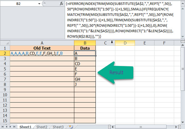ยกตัวอย่างตามภาพด้านล่างจะมีอักขระในเซลล์ A1 คั่นแต่ละส่วนด้วยเครื่องหมายคอมม่า ซึ่งจะพบว่ามีหลายส่วนเป็นค่าที่ซ้ำกัน หากเราต้องการแยกค่าเหล่านั้นออกมาแสดงในแต่ละเซลล์โดยผลลัพธ์เริ่มตั้งแต่ B2 เรียงลงไปด้านล่างโดยต้องการให้ค่าที่ซ้ำกันแสดงเพียงค่าเดียว เราจำเป็นจะต้องใช้สูตร Array เข้ามาช่วย